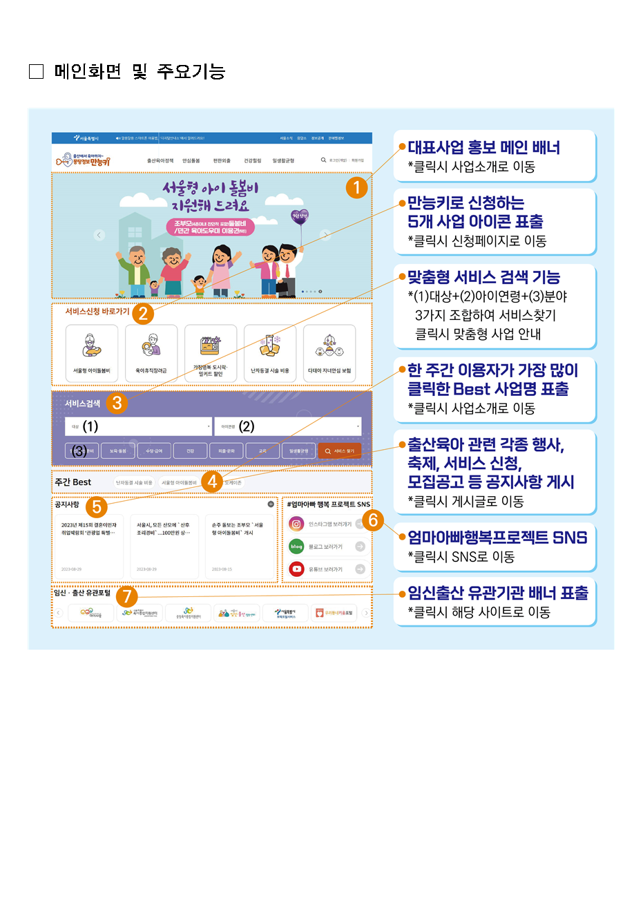 복지로, 서울 임신∙출산정보센터, 보육포털서비스, 우리동네 키움포털 등에서 개별적으로 제공되던 출산∙육아 관련 정보를 '몽땅정보만능키'에서 한 번에!