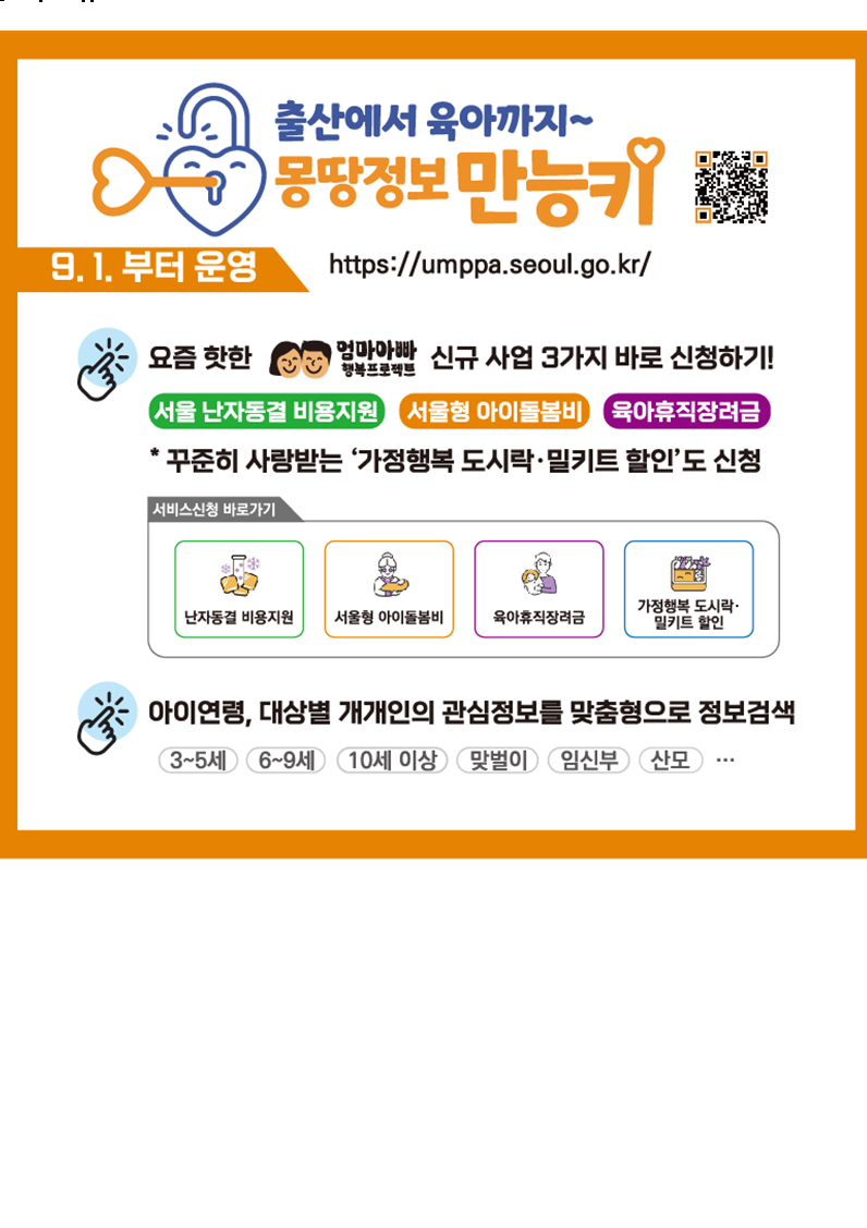 출산에서 육아까지 모든 정보를 한 눈에 볼 수 있다! '몽땅정보만능키' 들어보셨나요? 서울시에서 「엄마아빠 행복프로젝트」의 일환으로 '몽땅정보만능키'를 오늘 오전 10시에 오픈하였습니다.