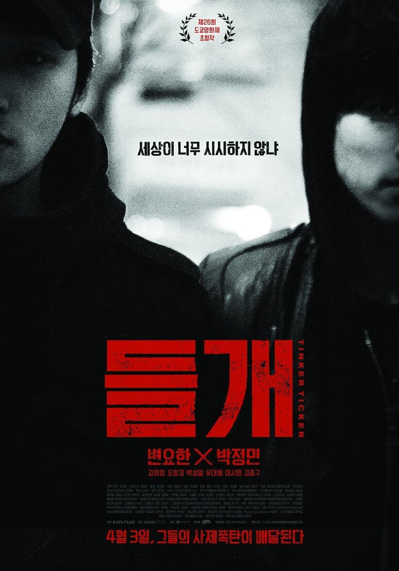 영화 <들개>는 2014년 4월 개봉한 범죄, 드라마 장르 독립영화입니다. 김정훈 감독의 한국영화아카데미 졸업 작품이자 데뷔작입니다. 이때까지만 해도 상업영화 쪽에서는 알려지지 않았지만 <토요근무(2011)> <재난영화(2011)> <목격자의 밤(2012)> <세 개의 거울-Trap(2013)> 등 단편영화계에서 유명했던 변요한이 사제 폭탄을 만드는 정구 역으로, <파수꾼(2011)>에서 좋은 연기를 선보인 박정민이 폭탄을 터뜨리는 괴짜 효민 역으로 출연합니다. 신선한 소재와 배우들의 연기가 호평받아 8점 대의 높은 평점을 받았습니다. 3,408명의 관객 수를 기록했고 언제 터질지 모르는 그들의 시한폭탄 같은 이야기는 102분 동안 이어집니다. 제26회 도쿄영화제 초청작이며 웨이브, 왓챠에서도 감상할 수 있습니다.